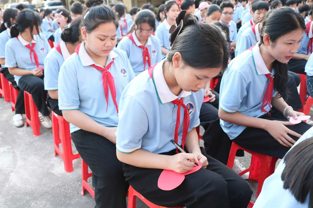 Em Nguyễn Phương Mai lớp 9A đại diện các em học sinh nhà trường đã bày tỏ lòng biết ơn sâu sắc tới các thế hệ cha anh, đồng thời thể hiện quyết tâm học tập, rèn luyện để xứng đáng với truyền thống anh hùng của dân tộc.