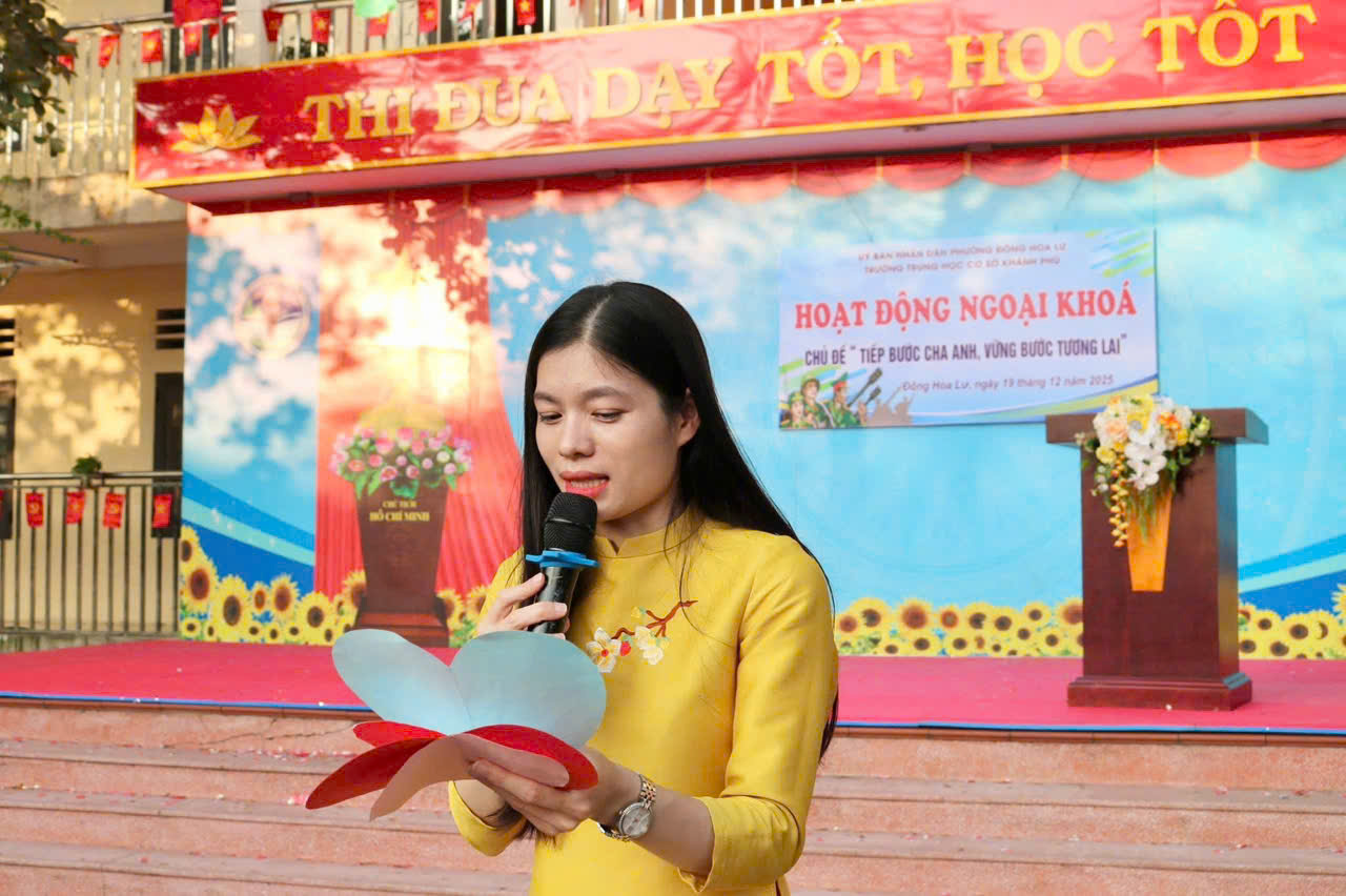 Cô giáo Nguyễn Thu Hoài – Hiệu trưởng nhà trường đã phát biểu khai mạc buổi HĐNK trong đó khẳng định ý nghĩa lịch sử của ngày 22/12, nhấn mạnh truyền thống vẻ vang của Quân đội Nhân dân Việt Nam và vai trò của giáo dục trong việc bồi dưỡng lý tưởng, trách nhiệm cho thế hệ trẻ.