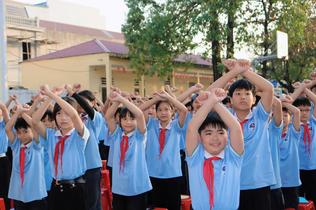 Các em học sinh toàn trường tham gia biểu diễn bài võ cổ truyền Vovinam, thể hiện tinh thần rèn luyện thể chất, ý chí kiên cường và bản sắc văn hóa dân tộc.