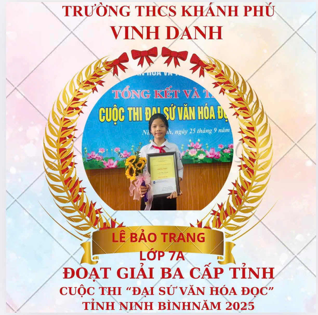 Hi vọng sau mỗi cuộc thi và kết quả mà em Lê Bảo Trang đã đạt được sẽ lan toả niềm đam mê đọc sách đến mỗi học sinh trong nhà trường !Để rồi từ những trang sách các em sẽ viết nên hành trình tri thức và gặt hái thành công!